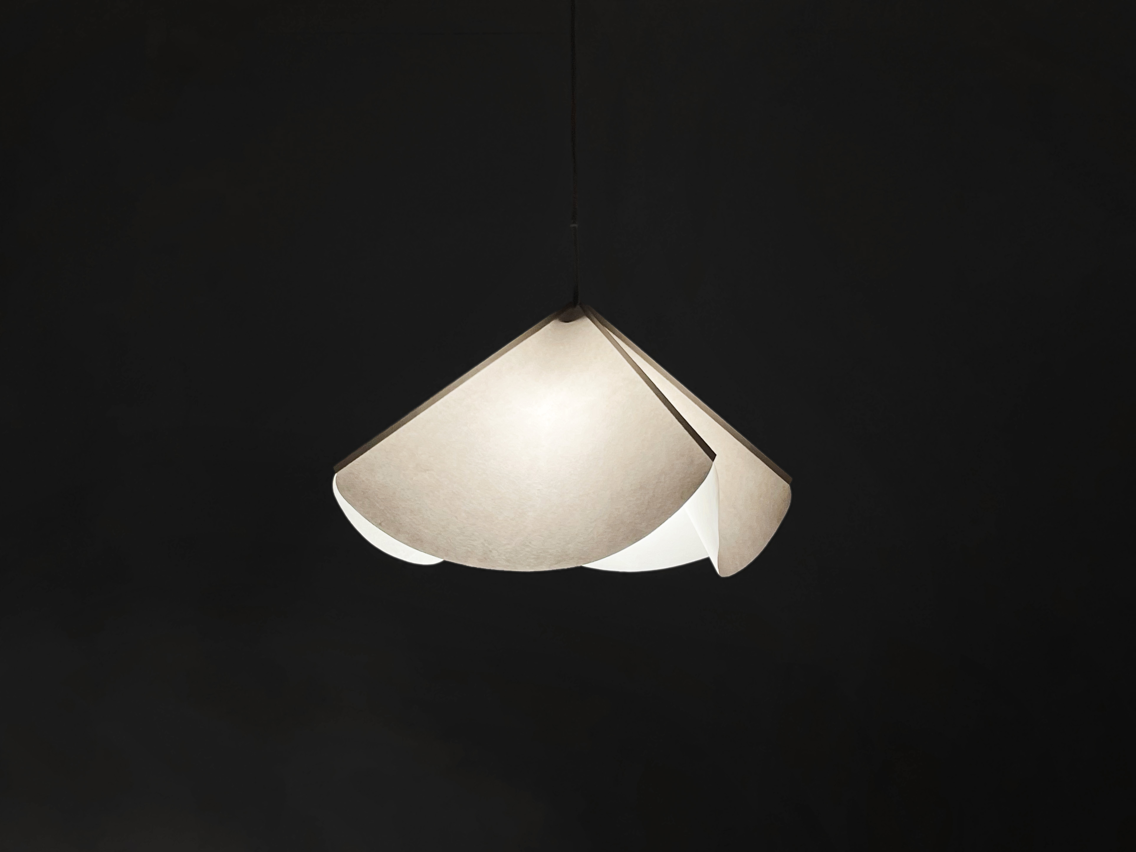 Light passes through the material, highlighting its surface qualities and becoming a soft luminous presence in the room. A sliding piece on the cable keeps the four panels separate.
